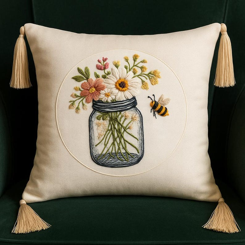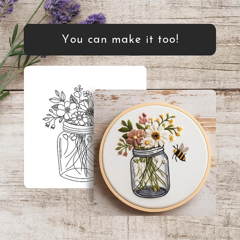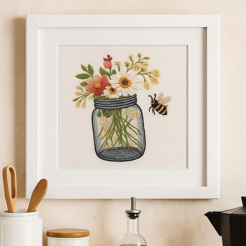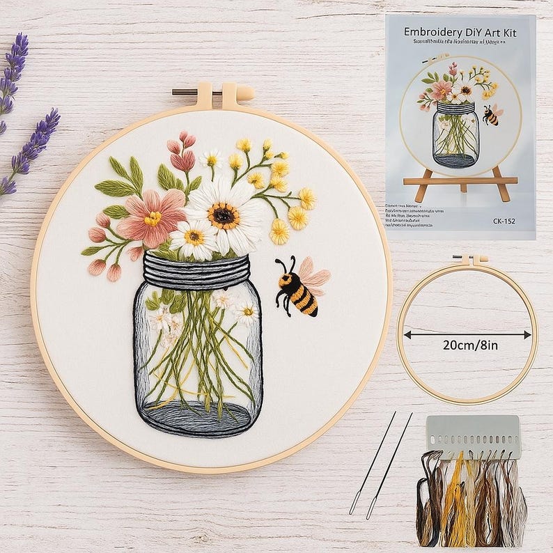 Bring the charm of nature into your home with our Bee & Wildflower Embroidery Kit. This DIY hand embroidery set features a delicate bouquet of wildflowers in a mason jar with a buzzing bee, perfect for creating a stunning piece of handmade wall decor. Ideal for those who love floral crafts, mindful stitching, and creative relaxation.