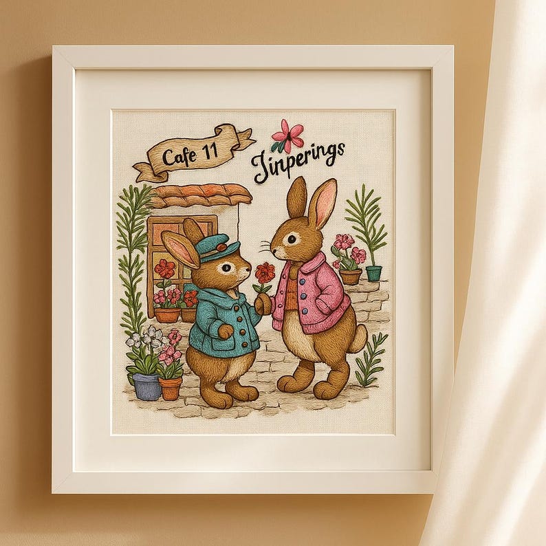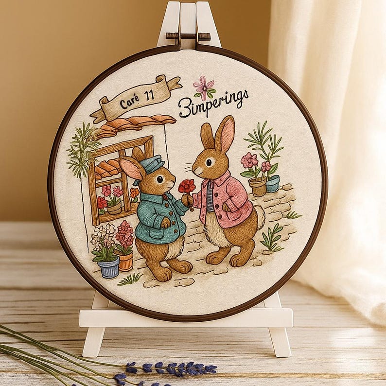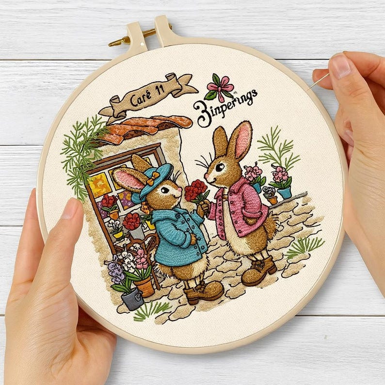 Bring a touch of charm to your home with this Bunny Embroidery Kit for Beginners, featuring two adorable rabbits outside a cozy café. Designed for ease and enjoyment, this DIY needlework set comes with everything you need to create a whimsical woodland scene full of warmth and detail.