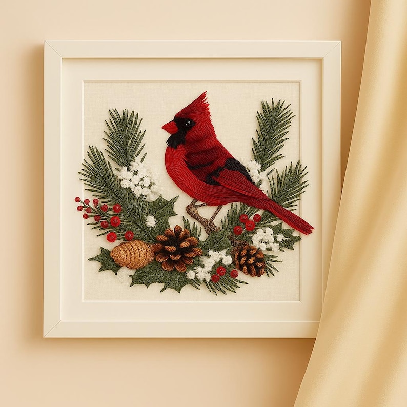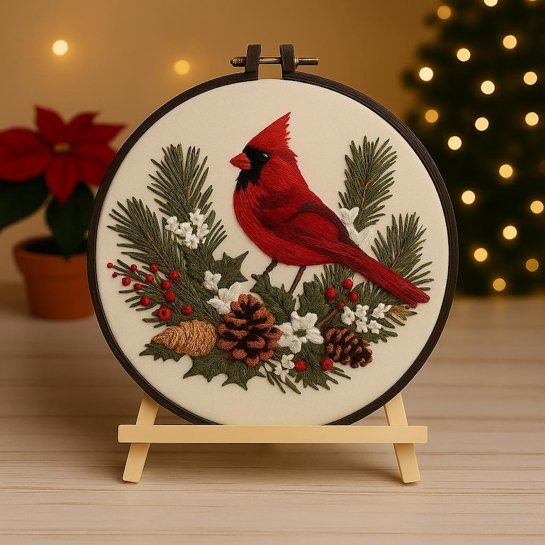 Bring warmth and color to your space with this Cardinal Bird DIY Embroidery Kit – a delightful craft project featuring a vivid red bird perched among pine branches, cones, and berries. This kit comes with all essential materials and easy instructions, allowing you to create a charming piece of handmade winter art.