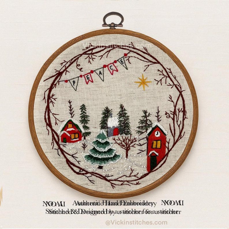 Celebrate the spirit of the holidays with this cozy Christmas Village Embroidery Kit. The design captures a peaceful snowy village framed by a rustic twig wreath, a golden star shining above, and a cheerful “PEACE” banner across the sky. Perfect for relaxing winter stitching, thoughtful gift-giving, or adding handmade Christmas décor to your home.