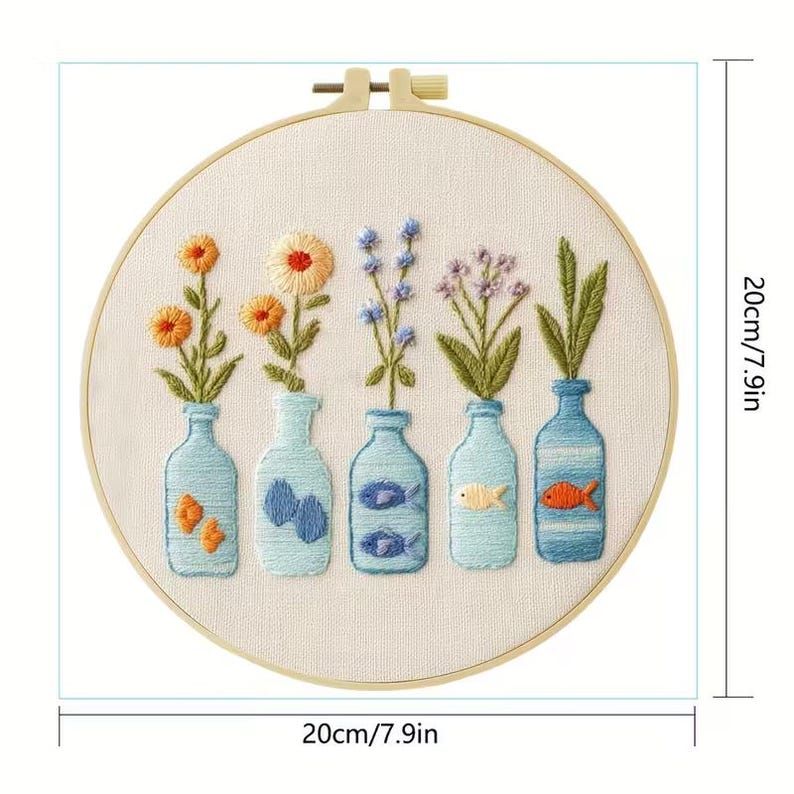 Discover the joy of embroidery with this delightful DIY kit! Featuring five charming glass bottles filled with delicate flowers and tiny fish, this kit is perfect for beginners and craft enthusiasts alike. The pre-printed fabric and included threads make it easy to follow the pattern and bring the design to life in vibrant colors. Create a beautiful piece of home decor or a thoughtful handmade gift while enjoying a relaxing and mindful crafting experience.