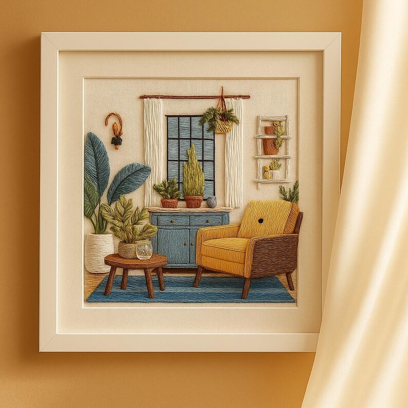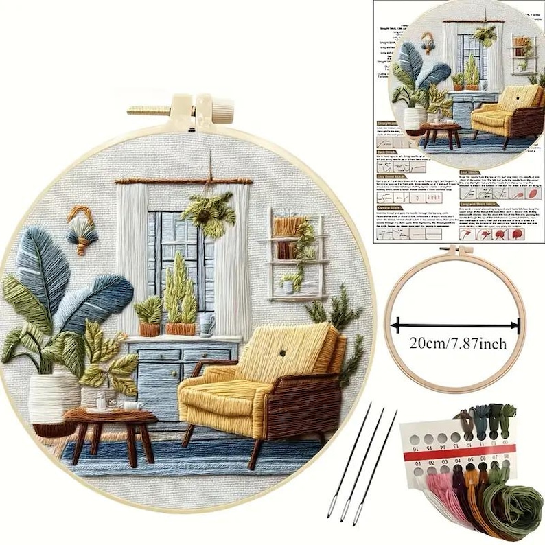 Add warmth and charm to your home with this Cozy Living Room Embroidery Starter Kit. Featuring a bright yellow armchair surrounded by lush indoor plants, this peaceful design captures the beauty of cozy home décor. Perfect for beginners and experienced stitchers alike, this DIY embroidery kit includes everything you need to create a beautiful piece of wall art.