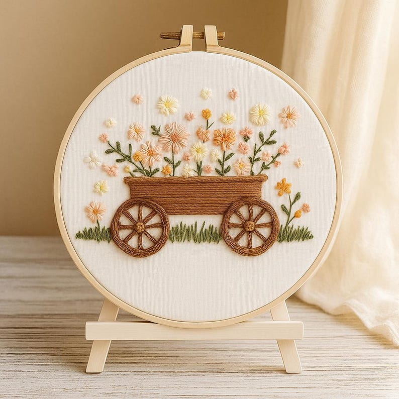 Bring rustic charm to your home with the Floral Wagon Embroidery Kit. This delightful DIY set lets you craft a wooden wagon overflowing with soft pastel blooms – a perfect mix of creativity and relaxation.