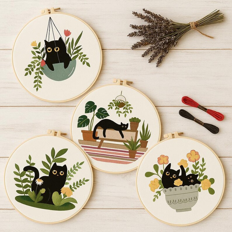 Add a touch of whimsy to your stitching sessions with our Funny Black Cat Embroidery Kit (Set of 4). Each design celebrates the playful spirit of black cats—whether they’re tangled in yarn, snoozing in baskets, peeking from boxes, or lounging in flowerpots.