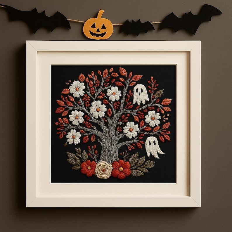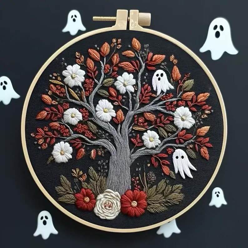 Bring a touch of magic to your decor with this Ghost, Flower & Tree Design Embroidery Kit. Featuring a whimsical tree surrounded by white blossoms and playful little ghosts, this charming DIY craft captures the cozy spirit of autumn.