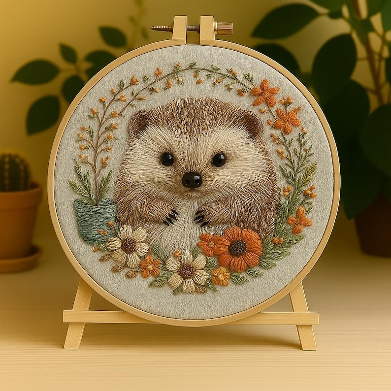 - Pre-printed embroidery fabric featuring a hedgehog and floral design
