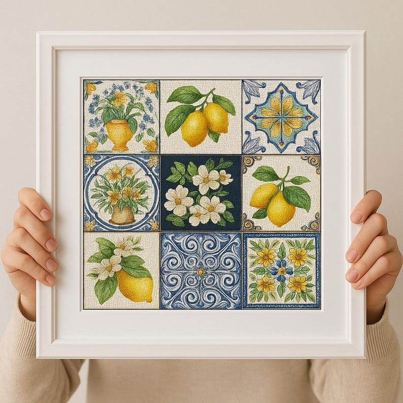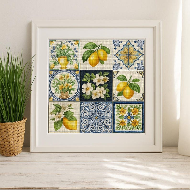 Bring the warmth of the Mediterranean into your home with our Mediterranean Lemon Cross Stitch Kit, inspired by classic Italian tilework. This elegant sampler features nine detailed motifs – from sun-kissed lemons to intricate floral and geometric patterns – capturing the beauty and vibrancy of coastal Italy.