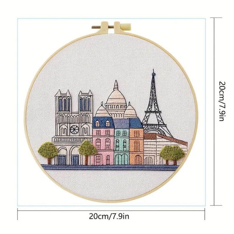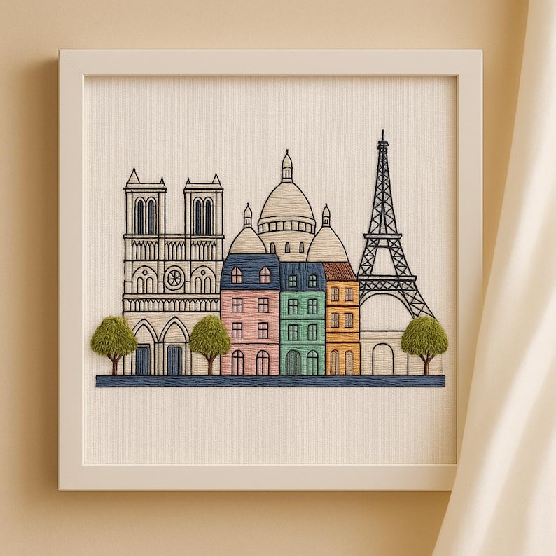 Capture the charm of Paris with this beautiful satin stitch embroidery kit featuring the Eiffel Tower, Notre-Dame Cathedral, Sacré-Cœur, and colorful Parisian houses. Designed for enjoyable and mindful stitching, this DIY set is perfect for crafters who love art, travel, and handmade decor.