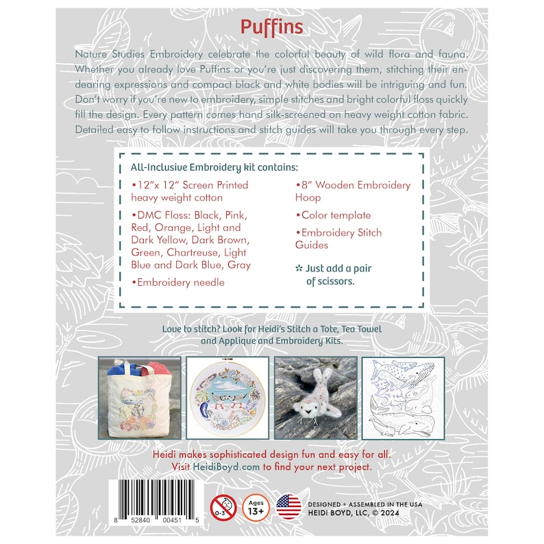 Capture the charm of the Atlantic Puffin with this Puffin Embroidery Kit from Heidi Boyd’s Nature Studies collection. This beautifully designed DIY embroidery kit celebrates the vivid colors and expressive details of these beloved seabirds. Using vibrant DMC floss and simple yet elegant stitches, you’ll bring to life the puffins’ striking black-and-white forms and bright beaks.