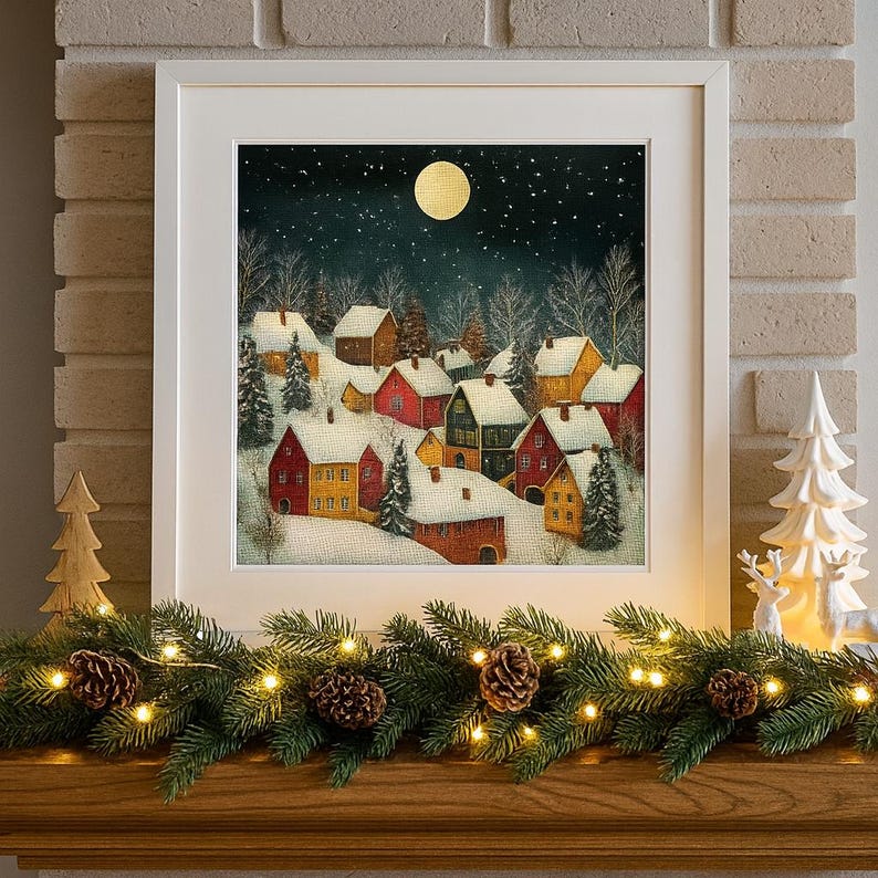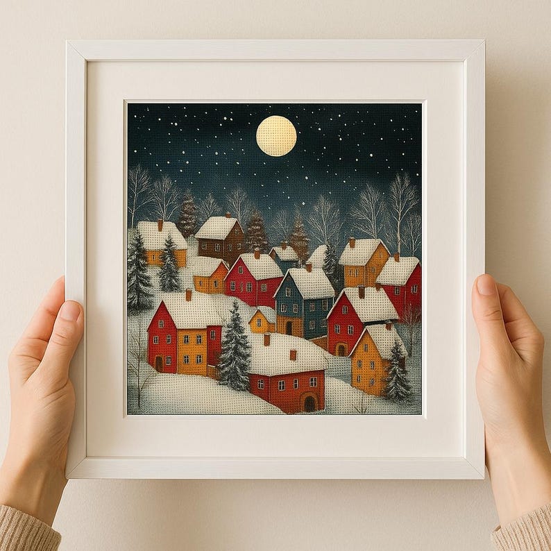 - Beautiful winter landscape with moon, houses, and trees