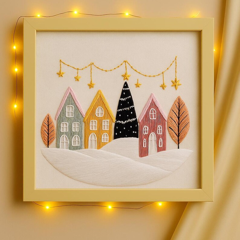 Bring the magic of the holiday season into your home with this Winter Town Christmas Embroidery Kit. Designed for beginners, this DIY kit features a charming snowy village with colorful houses, a decorated Christmas tree, and sparkling golden stars. Crafted on high-quality fabric, this cozy design makes a perfect seasonal project or a thoughtful handmade gift.