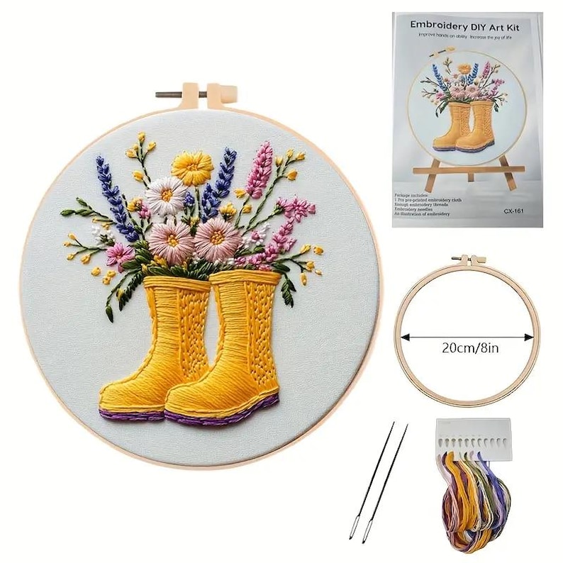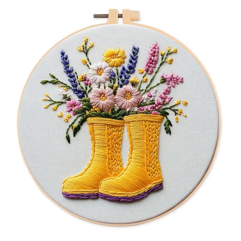 Bring a cheerful touch of spring to your home with our Yellow Boots Floral Embroidery Kit. This delightful DIY needlework set features a pair of bright yellow rain boots overflowing with colorful wildflowers – a perfect blend of charm and creativity.